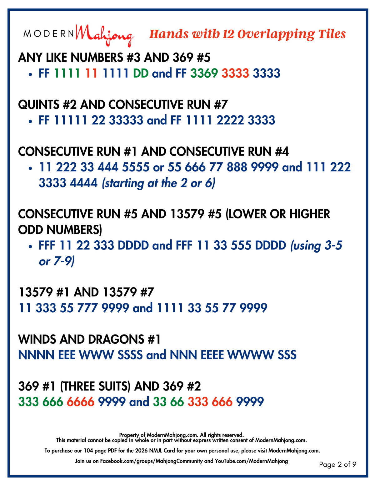 Free download of our Modern Mahjong Handout to be prepared to PIVOT. This is NOT the PDF that is sold separately. That is over 100 pages of strategy, groupings, Charleston, overlapping tiles and defense for the 2026 Card.