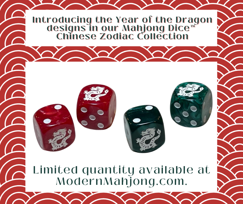 Click below to order individual pairs of our Year of Mahjong Dice™ Series, our 2024 Year of the Dragon (Red, Green, or White) and our Collector Set which includes 12 pairs of our Zodiac Collection in a canvas NMJL card zipper pouch. For the Collector Set, select red or green dragon at checkout.