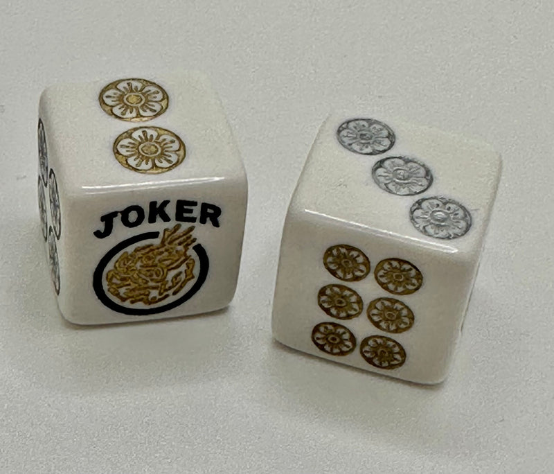 One Joker Away - one pair of white 19mm size dice with gold and silver