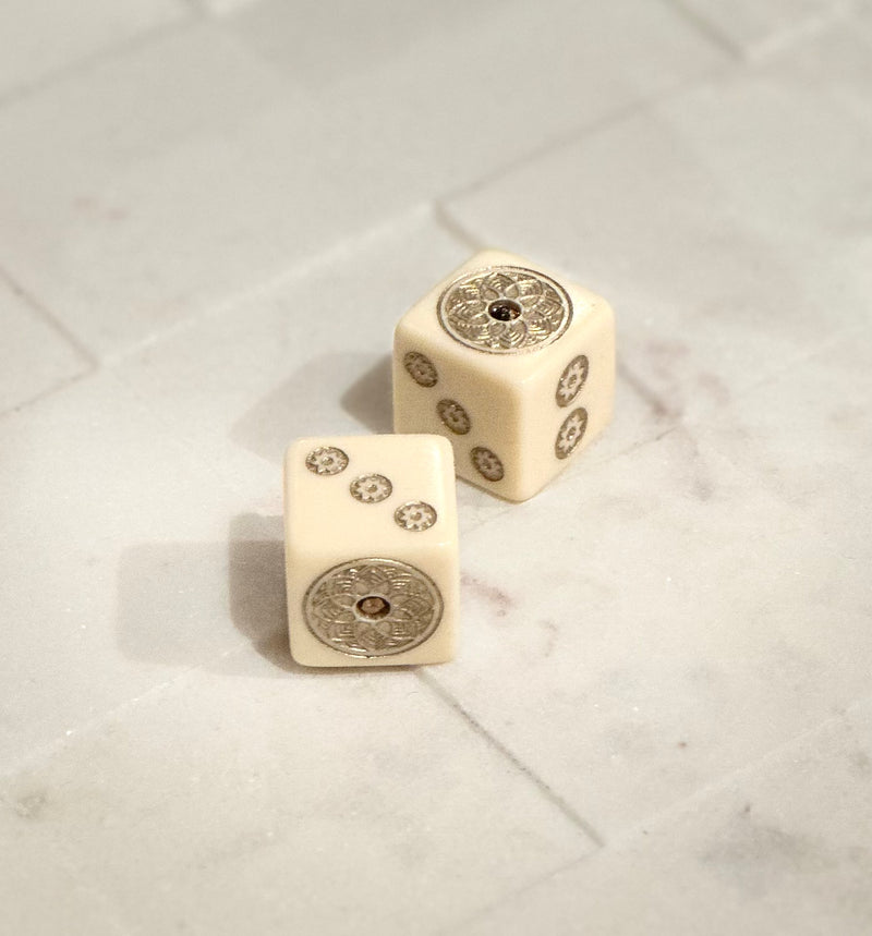 Gold Rush Bling - one pair 19 mm ivory color dice with gold & smoke topaz stone