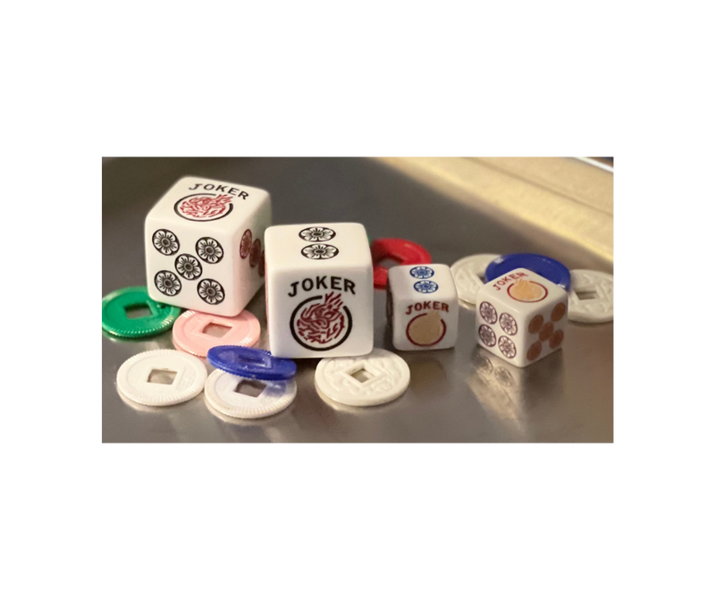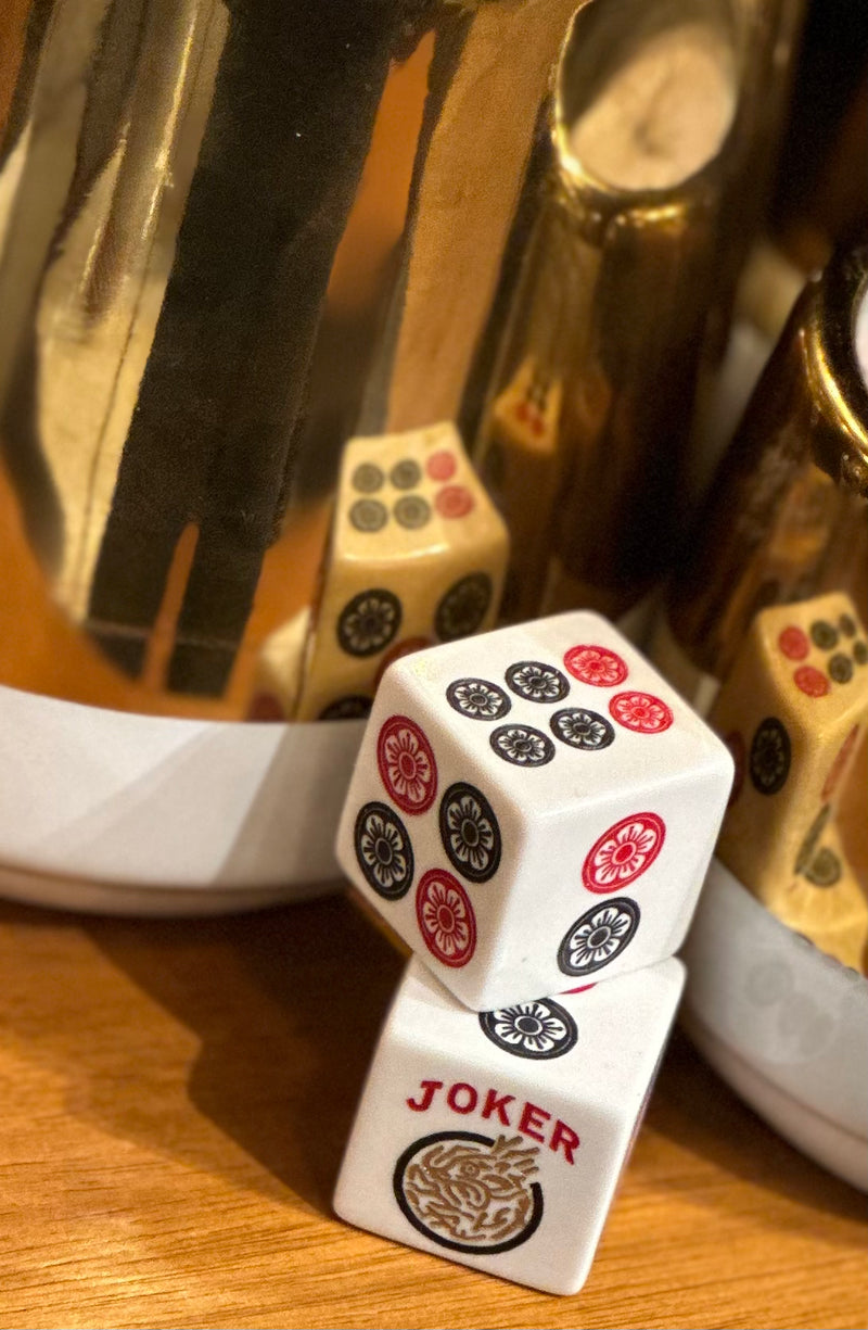 Jumbo Mahjong One Joker Away - one pair of 25mm white dice with red and black
